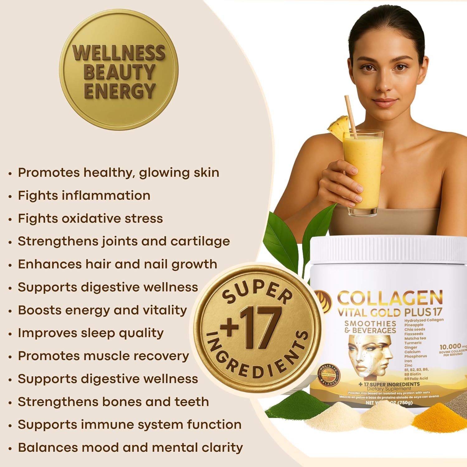 Enriched with +17 Superfood Ingredients: More than just collagen. Includes quinoa, oats, turmeric, vitamin C, magnesium citrate, zinc, biotin, folic acid, and more, carefully combined to maximize collagen benefits and provide a complete daily nutritional boost.