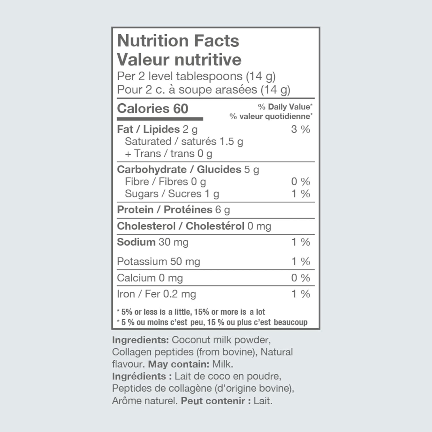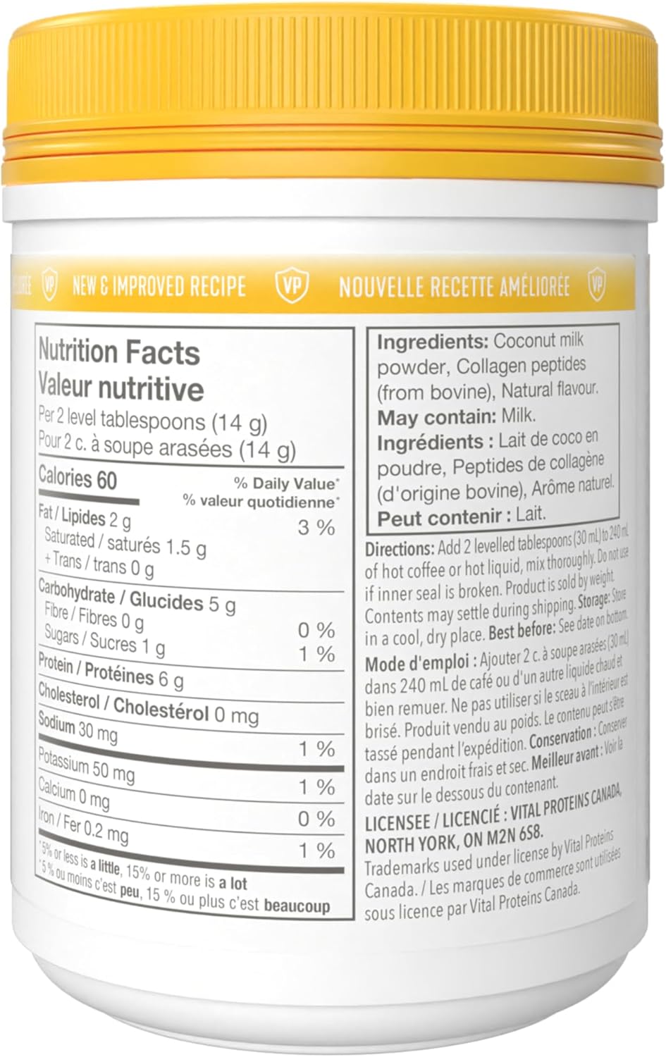 Vanilla-flavoured VITAL PROTEINS Collagen Creamer helps our bodies form collagen, which supports the structure and elasticity of our connective tissues, tendons, ligaments, and bones. VITAL PROTEINS Collagen Creamer provides 6g of bovine collagen peptides per serving and is made with coconut milk powder. It contains no added sugar, no artificial colours, and no artificial flavours. It is gluten-free, Kosher, and paleo-friendly. Now in more environmentally-friendly packaging that uses less plastic, VITAL PROTEINS Collagen Creamer is easy to take. Simply dissolve 2 tablespoons into the beverage of your choice, hot or cold, and mix until dissolved. VITAL PROTEINS. We are collagen.