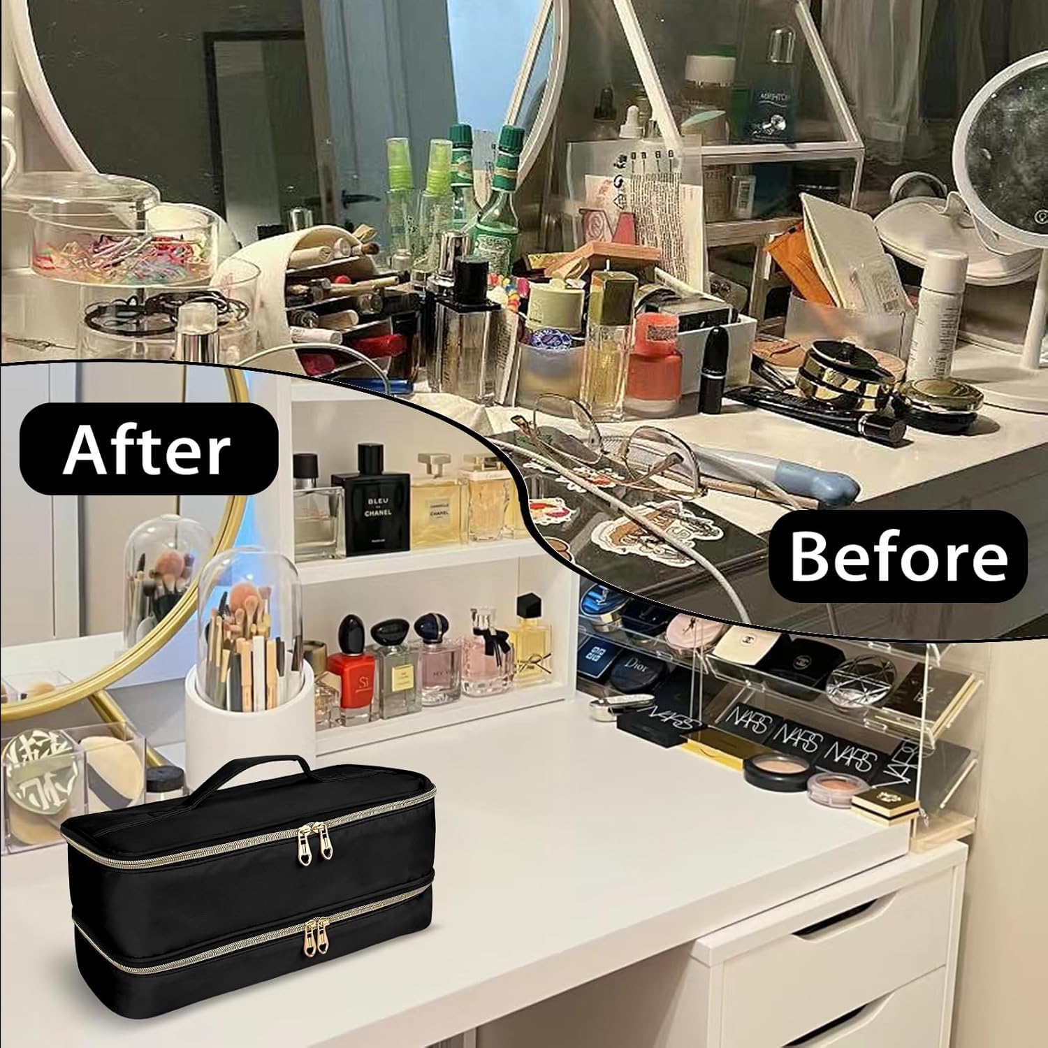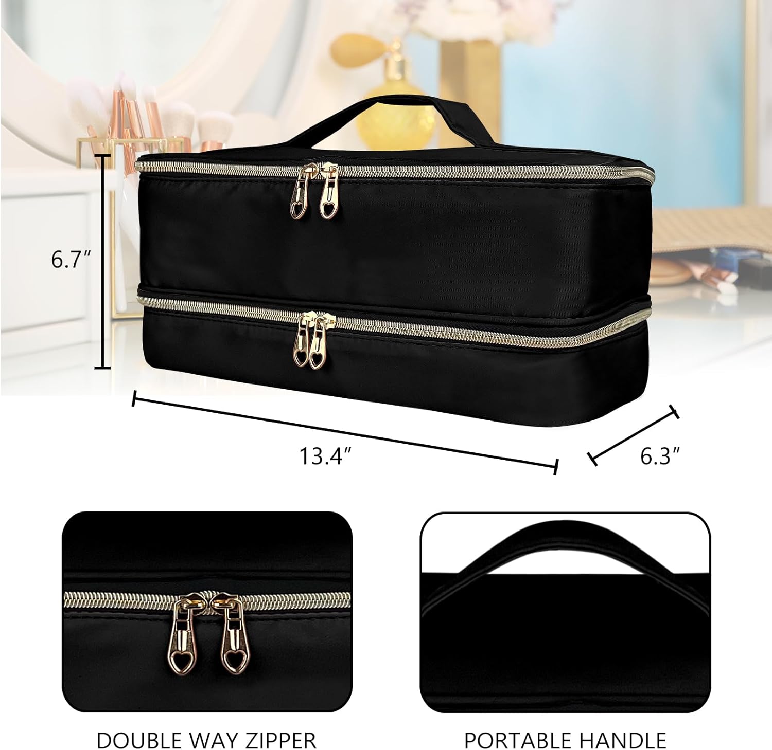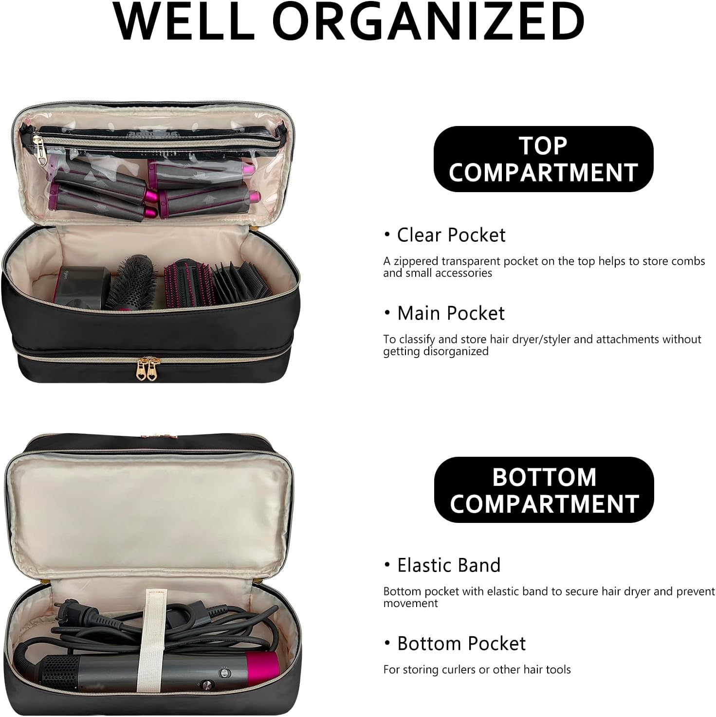 DOUBLE-LAYER DESIGN – To classify and store hair dryer/styler and attachments without getting disorganized and the thick inner lining provides excellent protection to protect them from bumps and scratches.