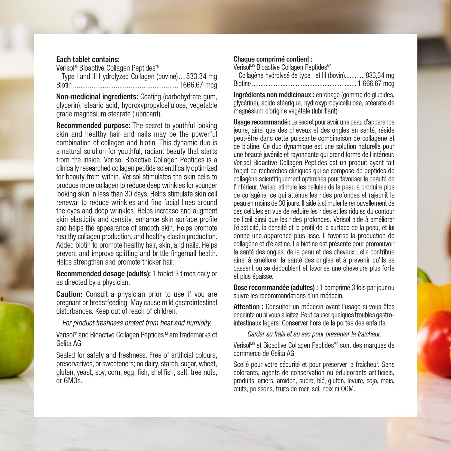 Collagen 30 with biotin from Webber naturals features 2500 mg of Verisol bioactive collagen peptides enhanced with 5000 mcg of biotin per serving for advanced nourishment of skin, hair, and nails. This dynamic duo promotes beauty from within, helping to reduce deep wrinkles for younger looking skin, and strengthen hair and nails in less than 30 days.