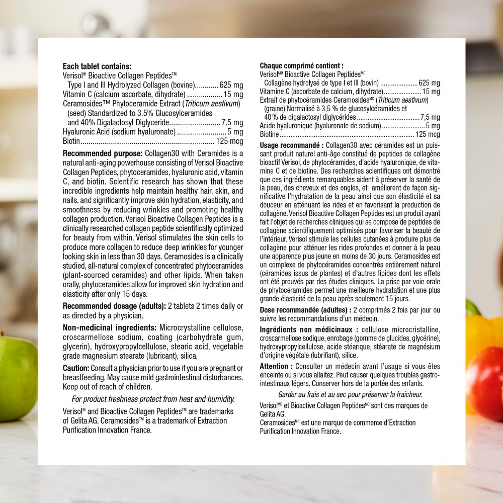 Collagen30 with Ceramides is a natural anti-aging powerhouse featuring Verisol Bioactive Collagen Peptides, Ceramosides phytoceramide extract, hyaluronic acid, vitamin C, and biotin. Clinically shown to reduce fine lines around the eyes and deep wrinkles, Collagen30 with Ceramides also significantly improves skin hydration and elasticity in 15 days.
