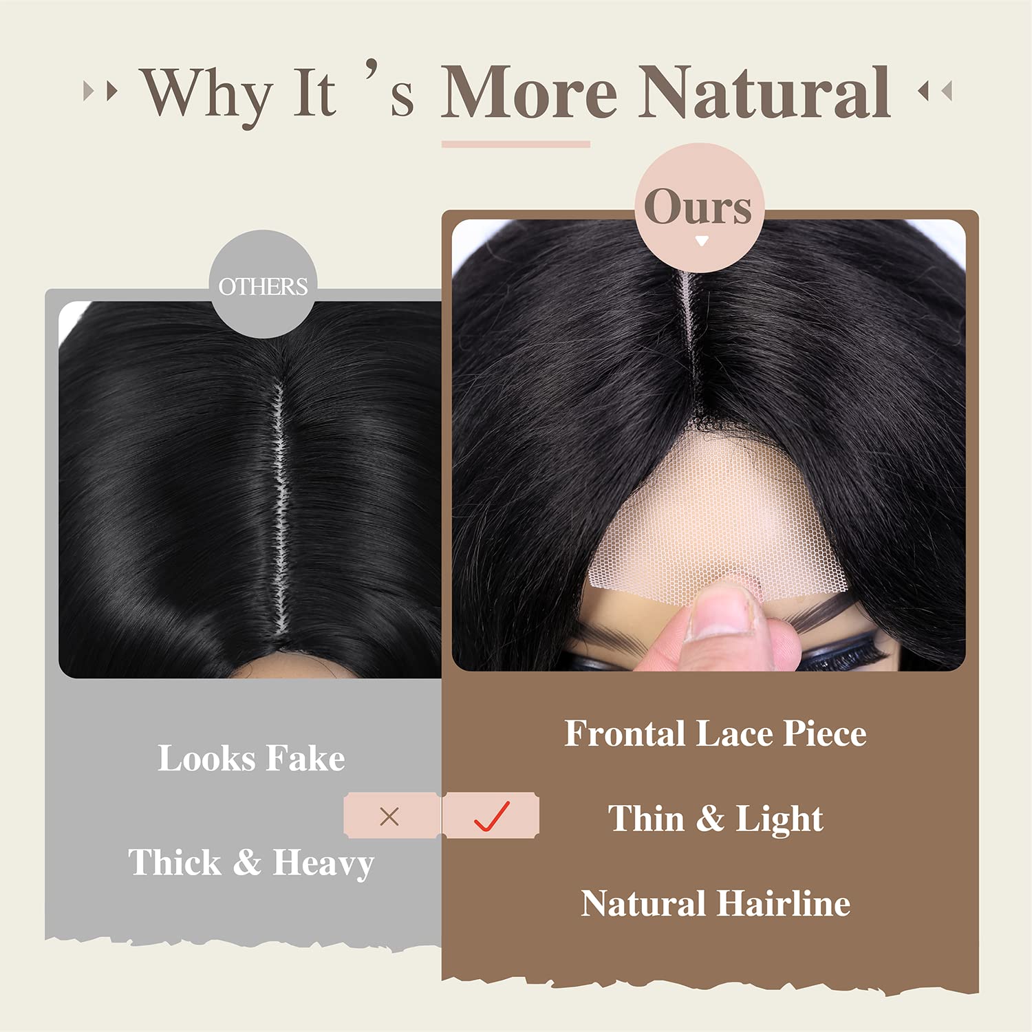 The black wavy wig is designed with a small lace front piece close to human scalp. So the hair part is quite natural. But customers can pluck the hairline or fix the hair part.