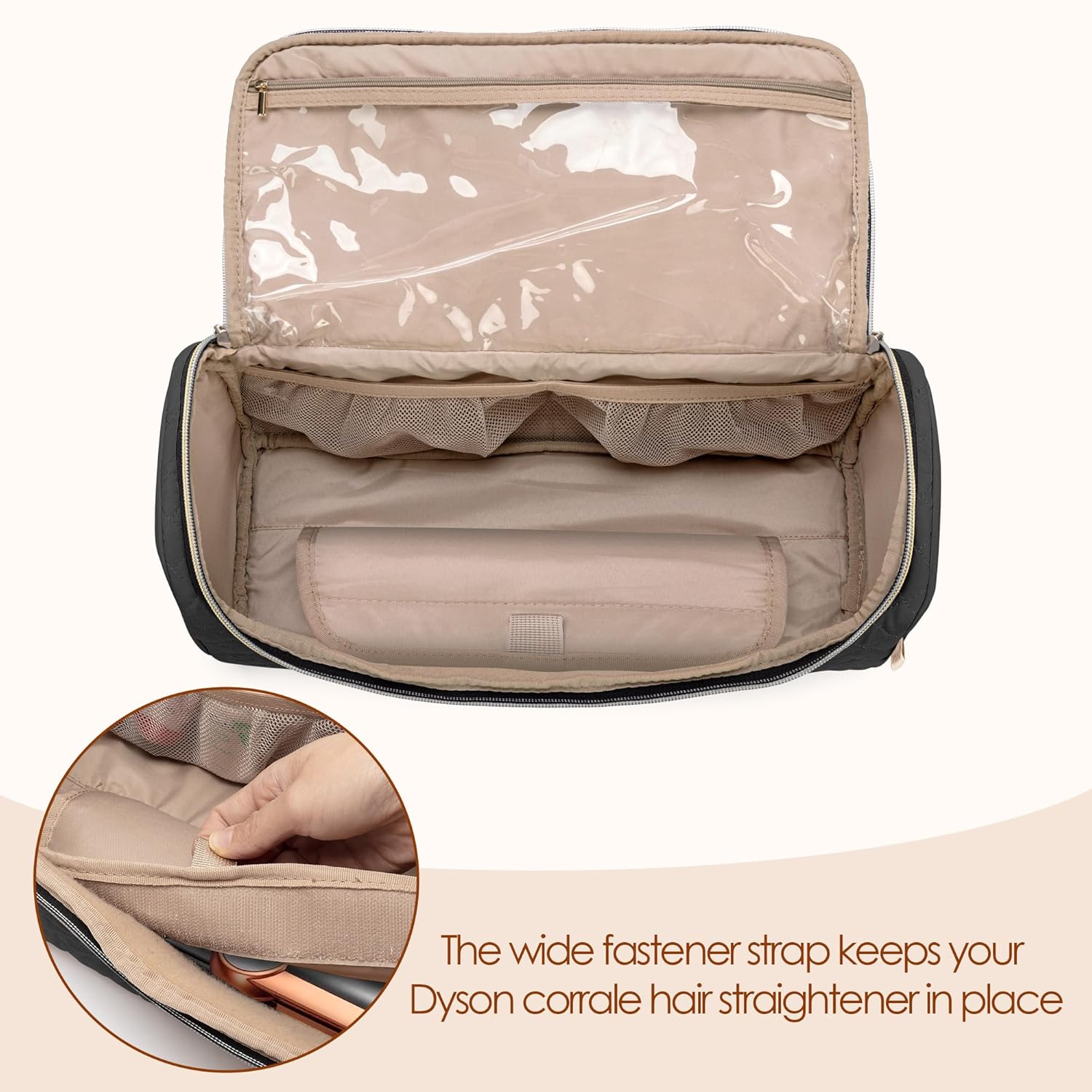 MAIN COMPARTMENT: A wide fastener strap wraps airstrait hair straightener in place and ensure security. Large transparent zipper pocket for paddle brush and detangling comb. 2 elastic mesh pockets for hair oil, ties and clips